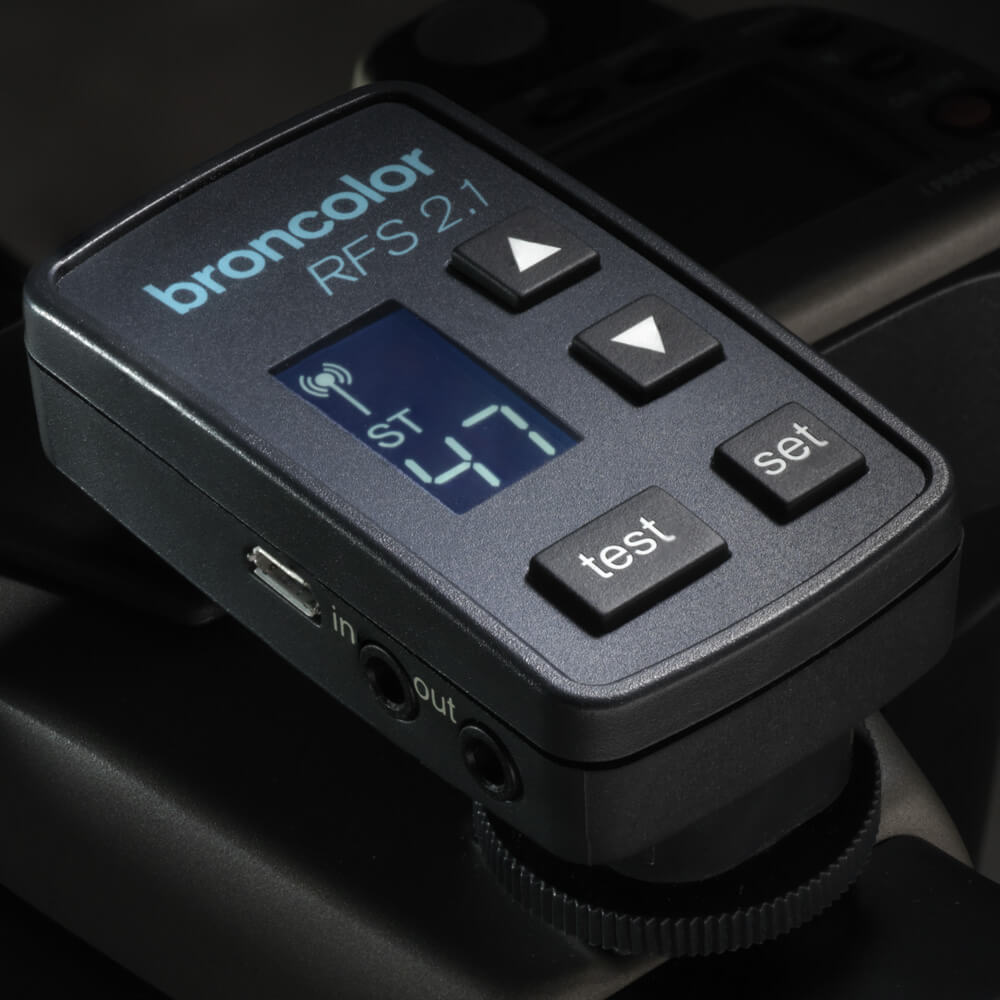 Universal TX/RX. Outdoors or in large halls, the operating distance of the broncolor RFS 2.1 is up to 200m, in closed rooms up to 50m. The transmission time (transmitter to receiver) is 0.425 ms. Two additional buttons allow the remote regulation of the power of all controlled flash units directly from the transceiver. Adjust the individual lamp outlets on the flash units and switch the modelling light on or off.