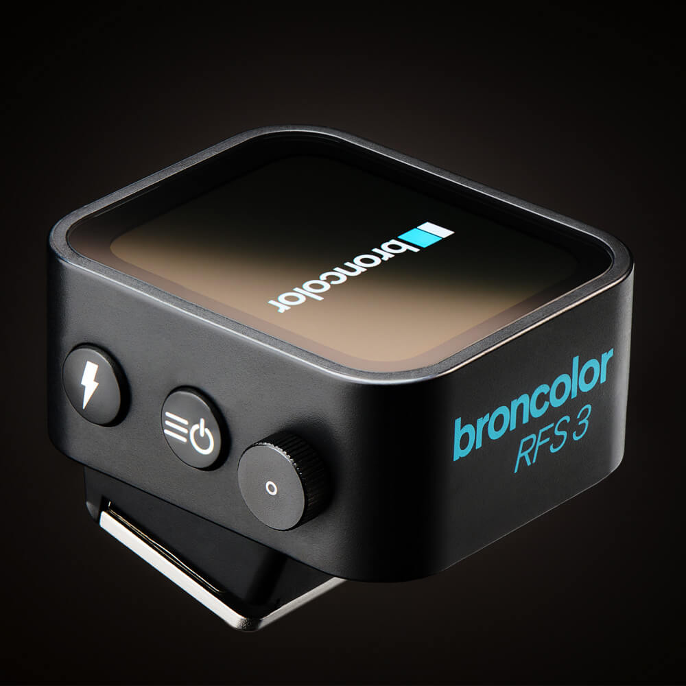The broncolor RFS 3 is a compact and lightweight (48g / 0.106 lbs) flash trigger with a high-contrast, full-colour OLED touch display, and high-Speed-Sync (HSS). All parameters can be adjusted through touch or via a small rotary control and two buttons for a tactile feel. The RFS 3 can control all current broncolor power packs and monolights (Satos, Scoro, Siros, and Move).