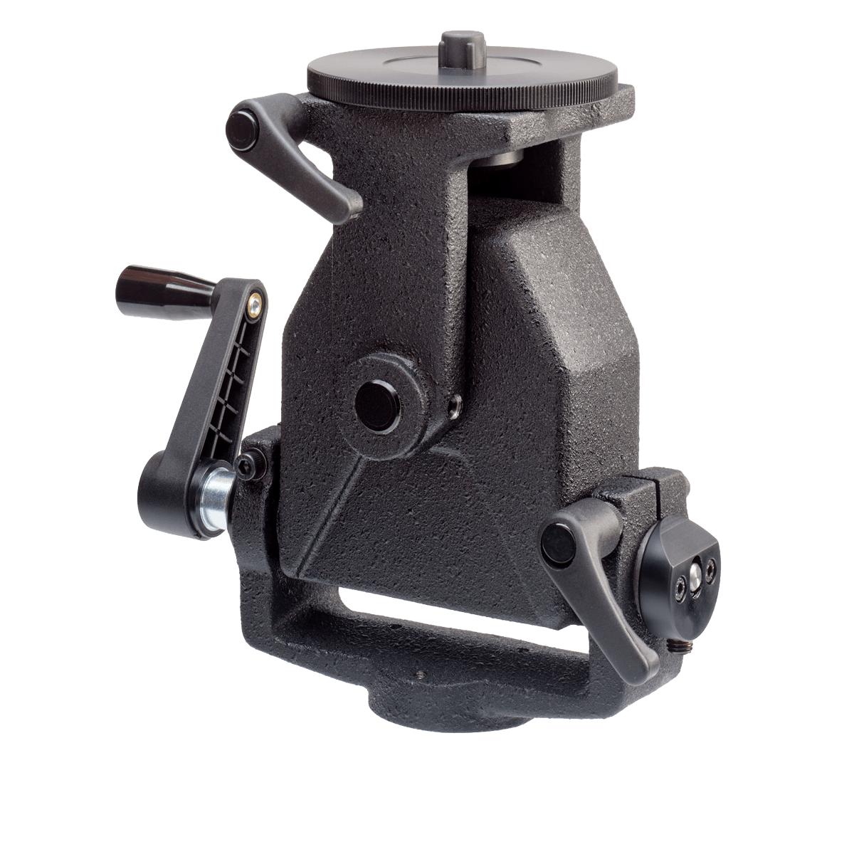 The ideal support for view cameras and other studio gear. This is a fully geared head operated by two cranks, for ease of use and stability. The geared movements are self-locking. The bottom and top plate both feature 360° rotation.